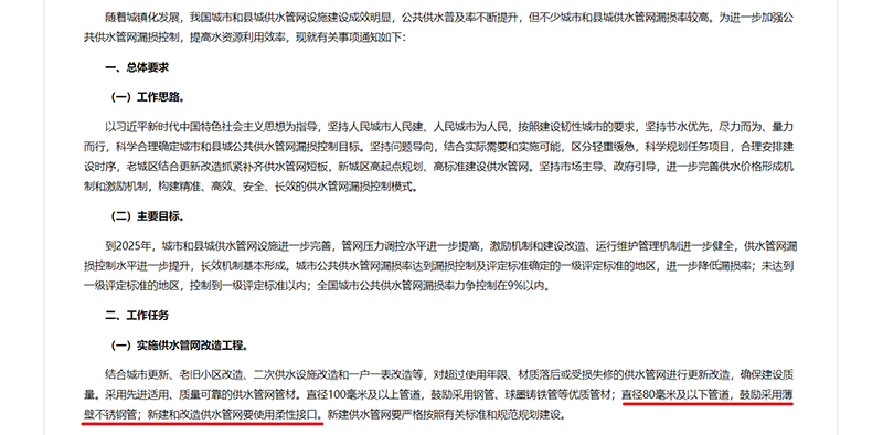今年年初,住建部、國家發(fā)改委下發(fā)《關于加強公共飲水管網(wǎng)漏損控制的通知》。通知中再次提出:實施供水管網(wǎng)改造工程,直徑80毫米及以下管道,鼓勵采用薄壁不銹管。