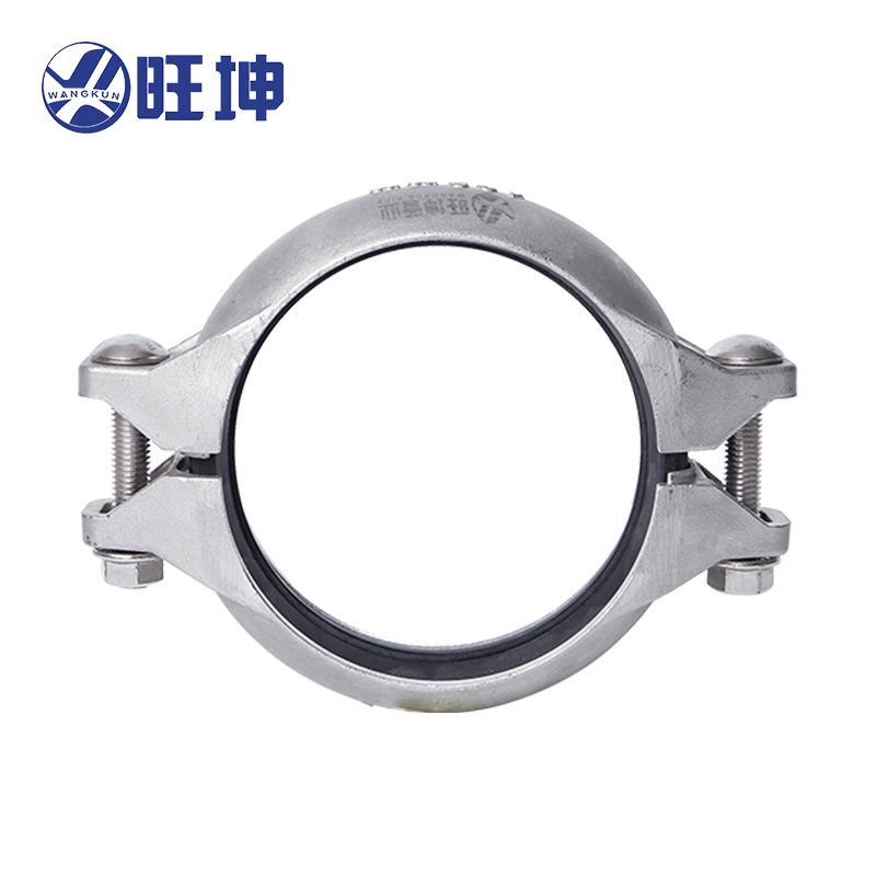 連接管道的外側(cè),并與預(yù)先滾制的溝槽相吻合,再在橡膠圈的外部扣上卡箍,然后用二顆螺栓緊固即可。由于其橡