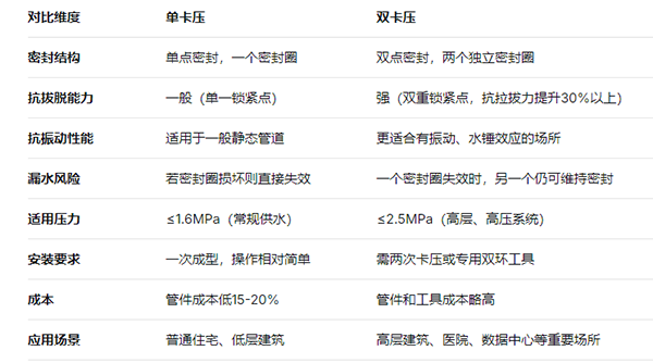 選購提示:優(yōu)先選符合 GB/T 19228 標(biāo)準(zhǔn)的產(chǎn)品,DN15–DN100 常用卡壓連接;高層、熱水 / 直飲水優(yōu)先選雙卡壓,普通多層冷水可選單卡壓控制成本。