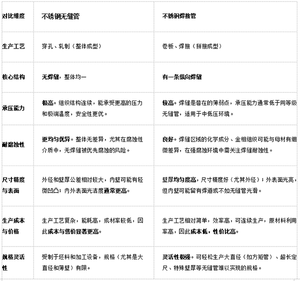 在工業(yè)與建筑領(lǐng)域,選擇不銹鋼無縫管還是不銹鋼焊管,往往令不少專業(yè)人士與采購者糾結(jié)。這兩種看似相似,實(shí)則“內(nèi)外有別”的管材,其差異遠(yuǎn)不止于有無焊縫。為了幫助您清晰理解,我們先通過一個(gè)概覽表,快速抓住它們最核心的區(qū)別。